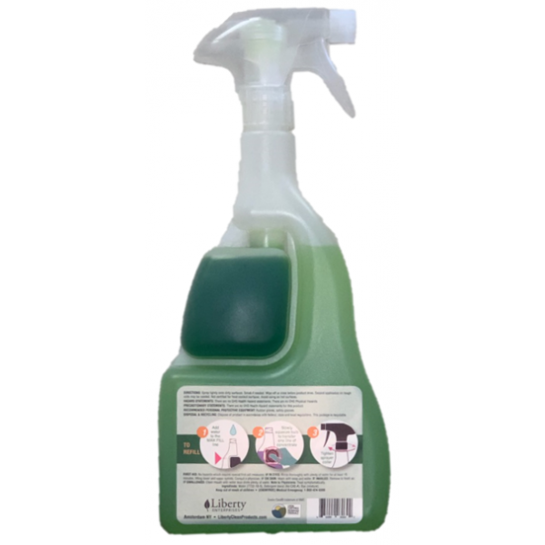 7 Bottles of All-Purpose Cleaner in 1. Our bio-based All-Purpose Cleaner is ideal for removing soils from most hard surfaces in any home or office environment. Directions: Spray lightly onto dirty surface. Scrub to remove any dirt and/or grease. Wipe off or rinse before product dries. Tough areas may require repeat application. Not certified for food contact surfaces. Avoid using on hot surfaces. Follow the easy three step pictogram on the back label to refill the bottle a total of 6 times. This product is marketed with the environment in mind. When using Liberty Clean, you have 7 refill's available per package saving the environment from 6 empty plastic bottles. Liberty Clean will save the end user money per bottle and reduce plastic waste in our landfills.