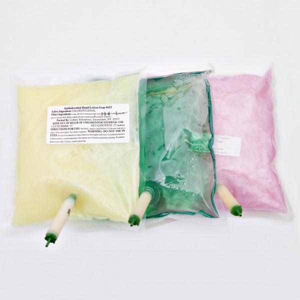 Creamy rich surfactant blend containing chloroxylenol antimicrobial agent, packaged in a "high volume" nozzle pouch.